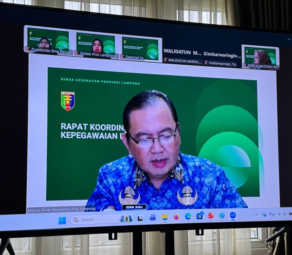 Bandar Lampung —– Kepala Dinas Kesehatan Provinsi Lampung menghadiri Rapat Koordinasi Program Kepegawaian dan Sumber Daya Manusia Kesehatan Tahun 2025 yang dilaksanakan secara daring pada Selasa, 28 Oktober 2025.